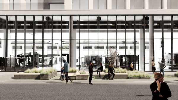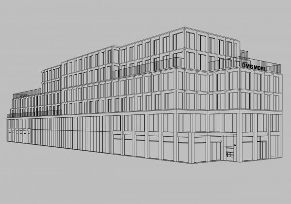 Im Erdgeschoss bildet ein großzügiger Showroom mit etwa 1.500 qm das Herzstück des Gebäudes. Hier werden Maschinen, Innovationen und Technologien von DMG MORI nicht nur ausgestellt, sondern räumlich inszeniert und für Kunden und Besuchergruppen erlebbar gemacht. Durch die transparente Fassadengestaltung öffnet sich der Showroom zur Plaza und zur Stadt – und setzt so ein klares architektonisches und gestalterisches Statement.